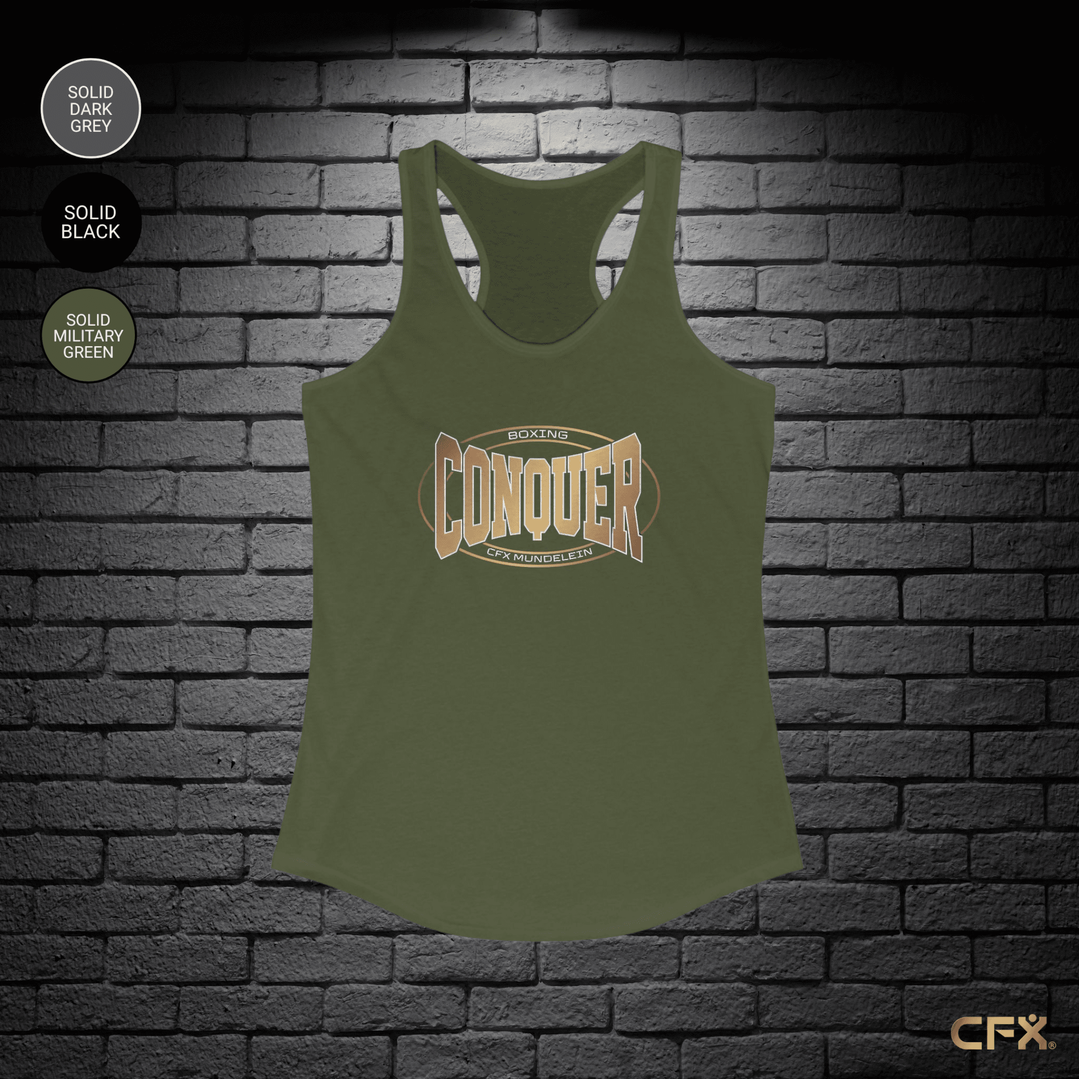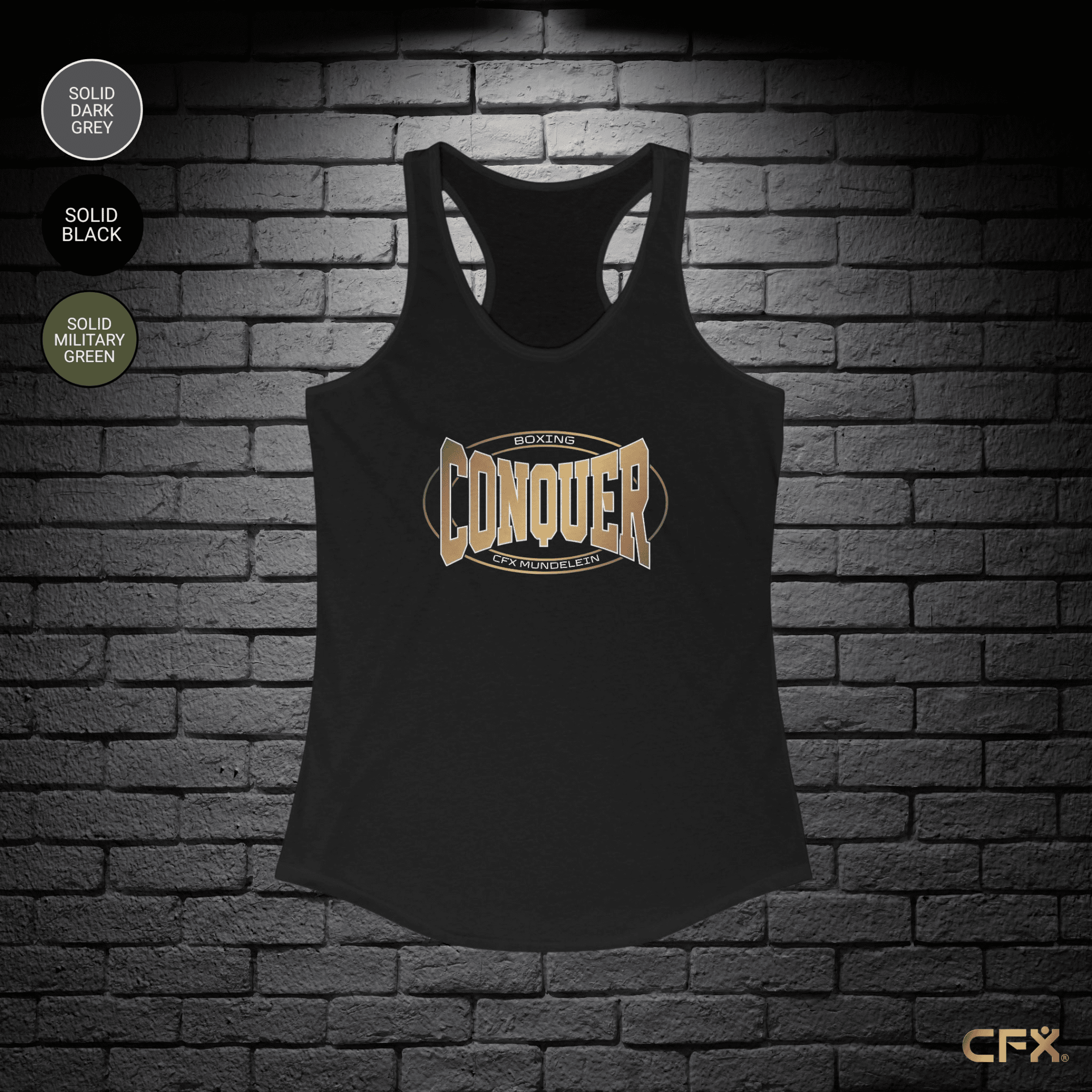 The Conquer Boxing Mundelein racerback tank features a flattering athletic cut and breathable fabric, built to move with you through every jab, hook, and burn.