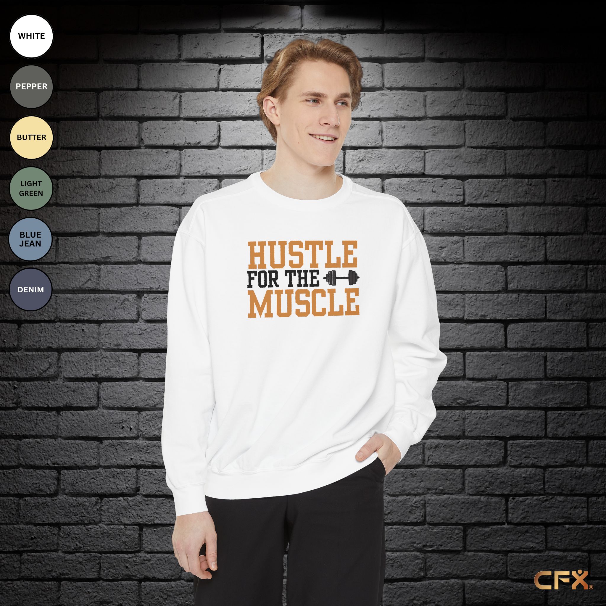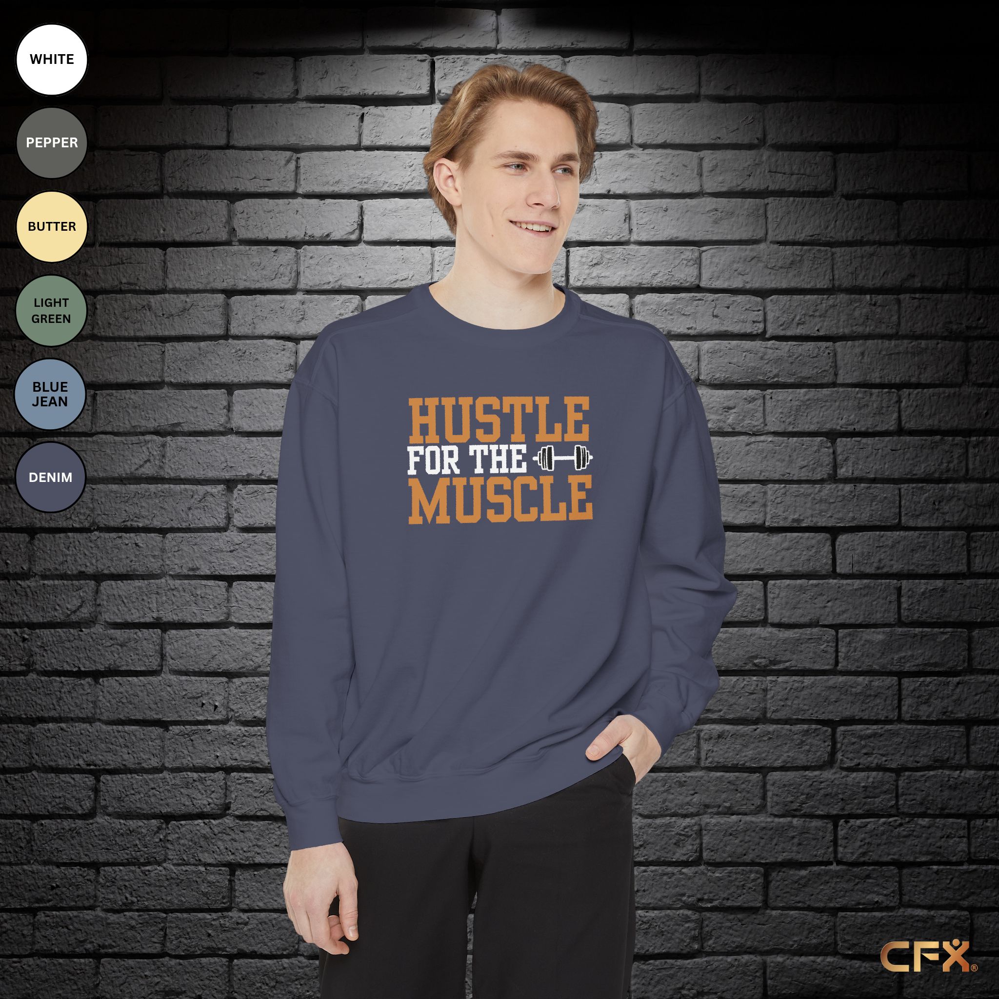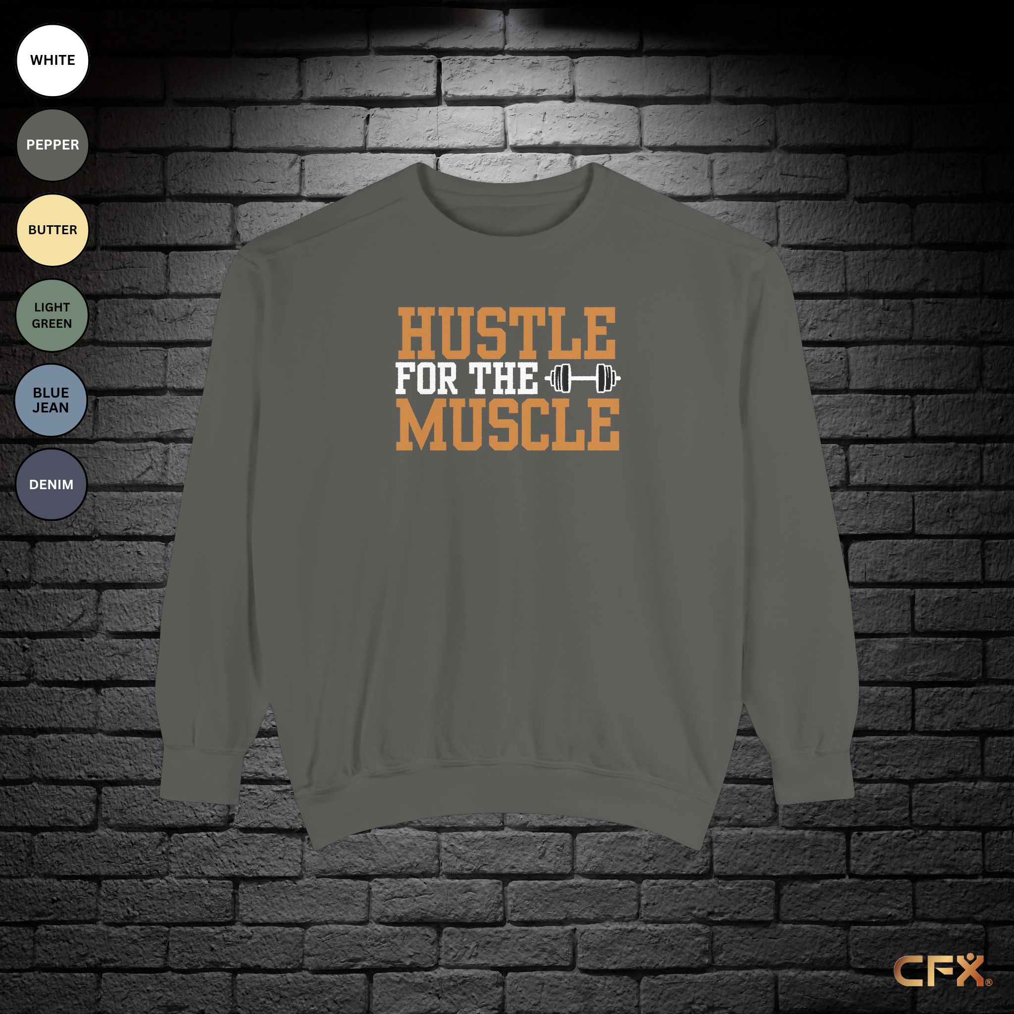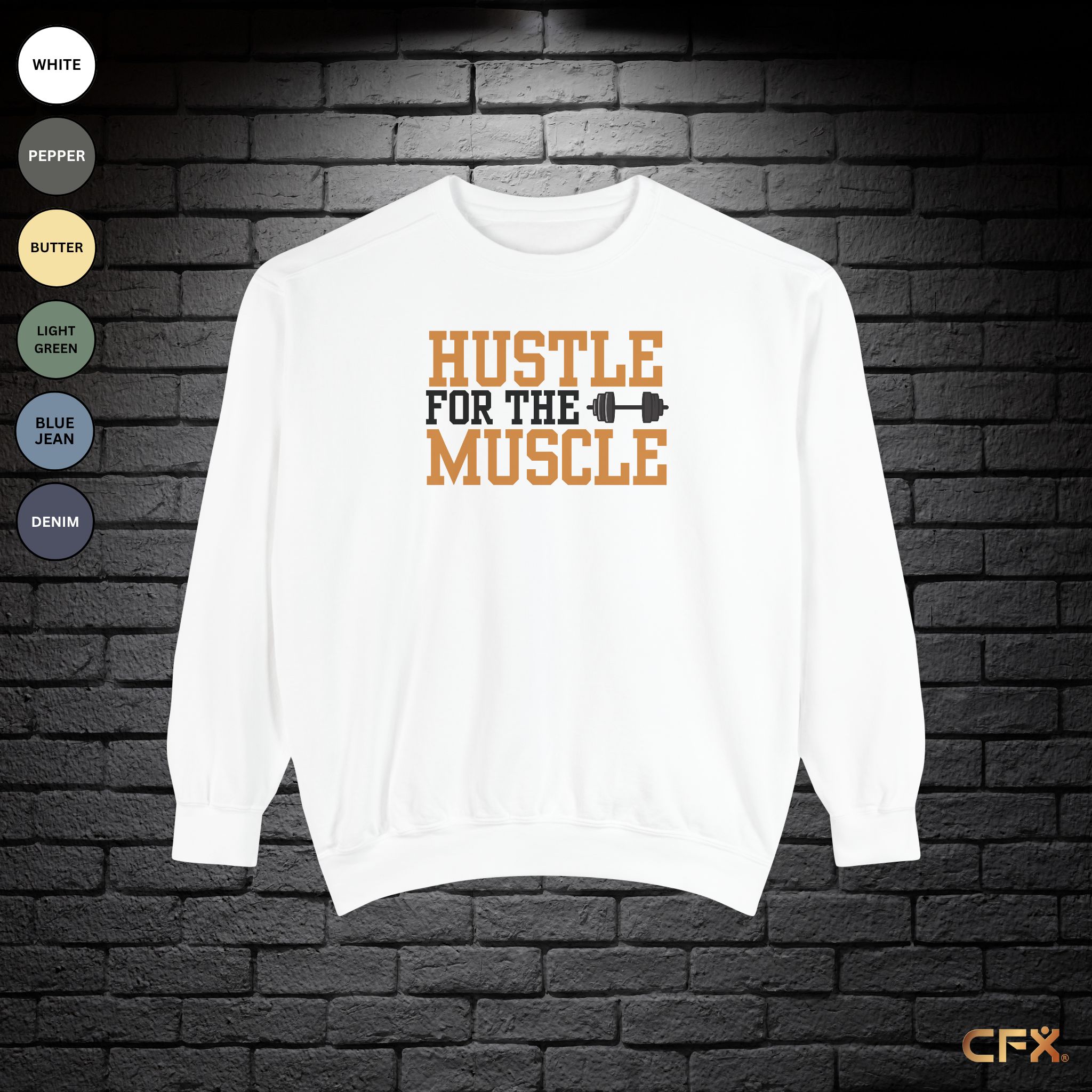 Features the Hustle for the Muscle design for a bold, athletic finish