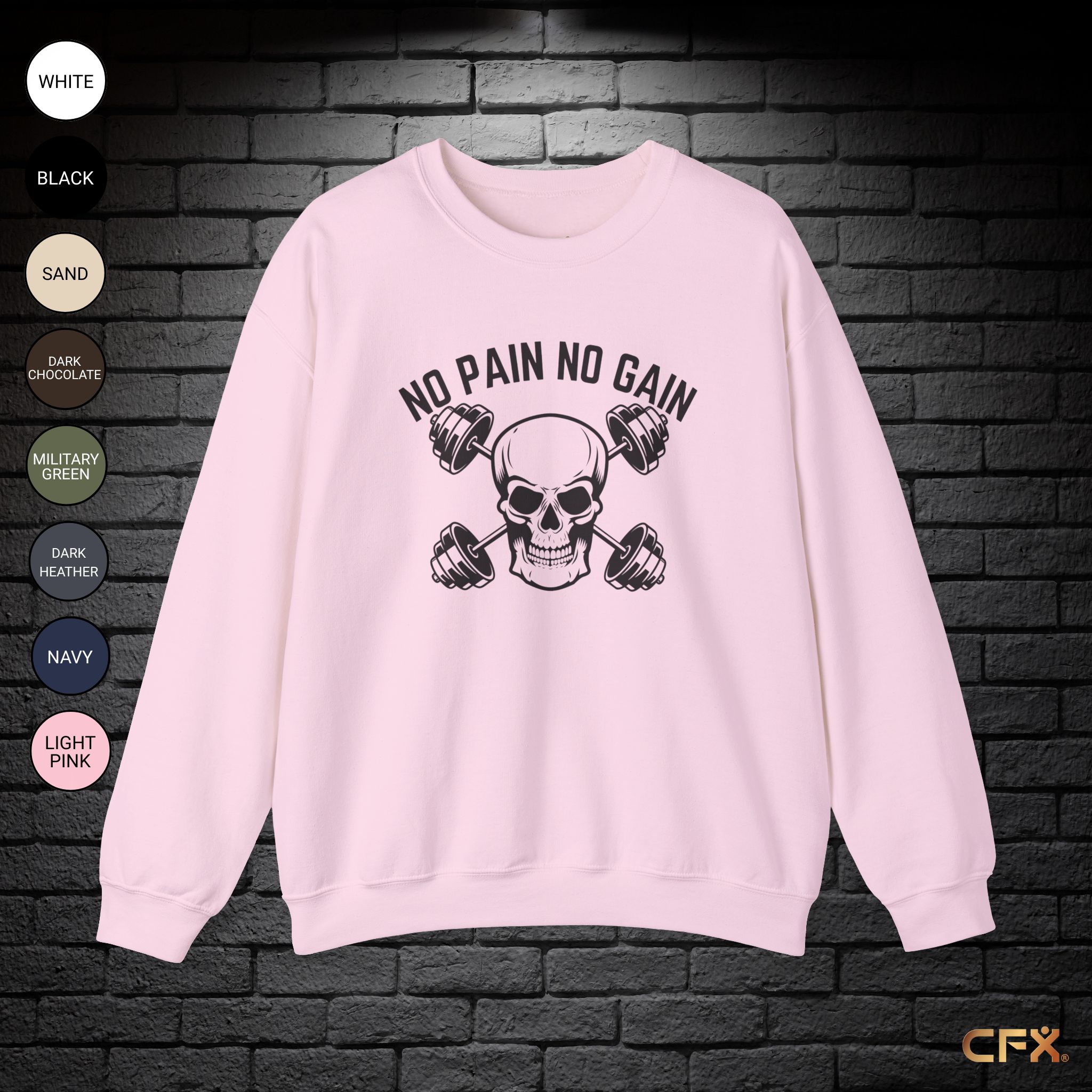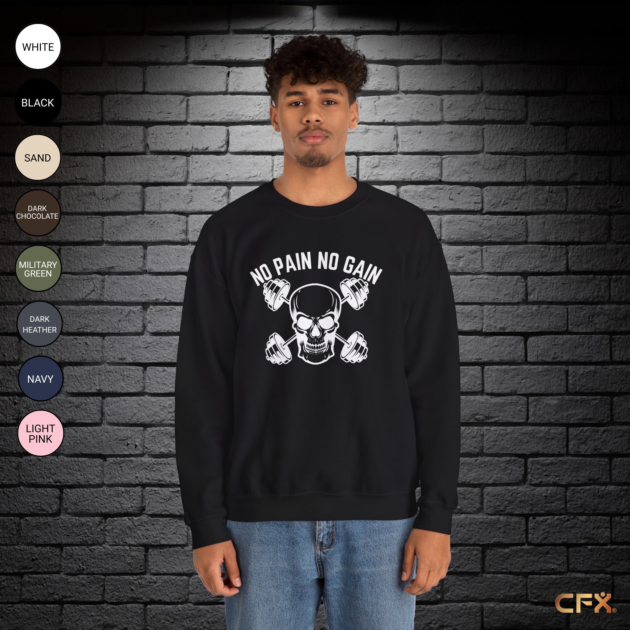 This Gildan crewneck sweatshirt puts the message front and center—No Pain No Gain. With a bold skull-and-weights graphic on the chest, this piece is made for those who show up, push hard, and never back down. Soft, warm, and ready for anything, it’s your new go-to for training days, recovery days, and everything in between.